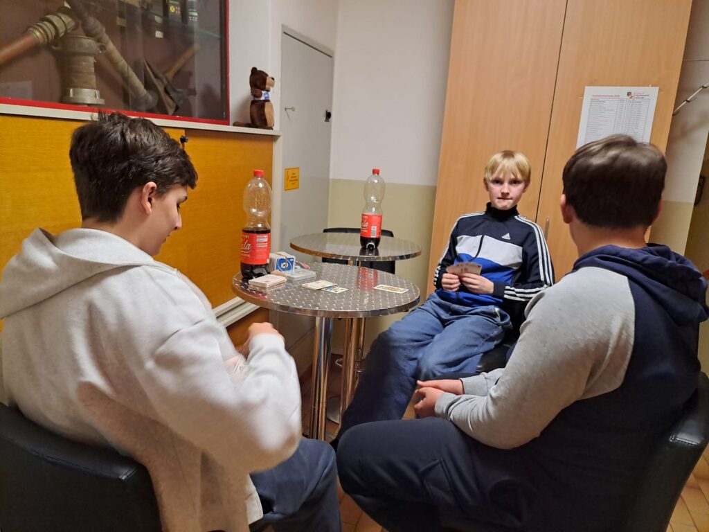 Nach dem Essen machte es sich die Jugendgruppe in unserem Mannschaftsraum gemütlich, um die Nacht zu verbringen. Mit Unterhaltungen, spaßigen Filmen sowie spannenden Geschichten ging die Nacht mit 3 Stunden Schlaf vorüber.