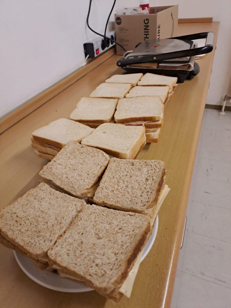 Im Anschluss wurden Matten, Decken und Schlafsäcke ausgepackt und der Mannschaftsraum wurde zum Schlaflager. Unsere Jugendbetreuerin Lisi machte als Abendessen noch für alle Toasts.