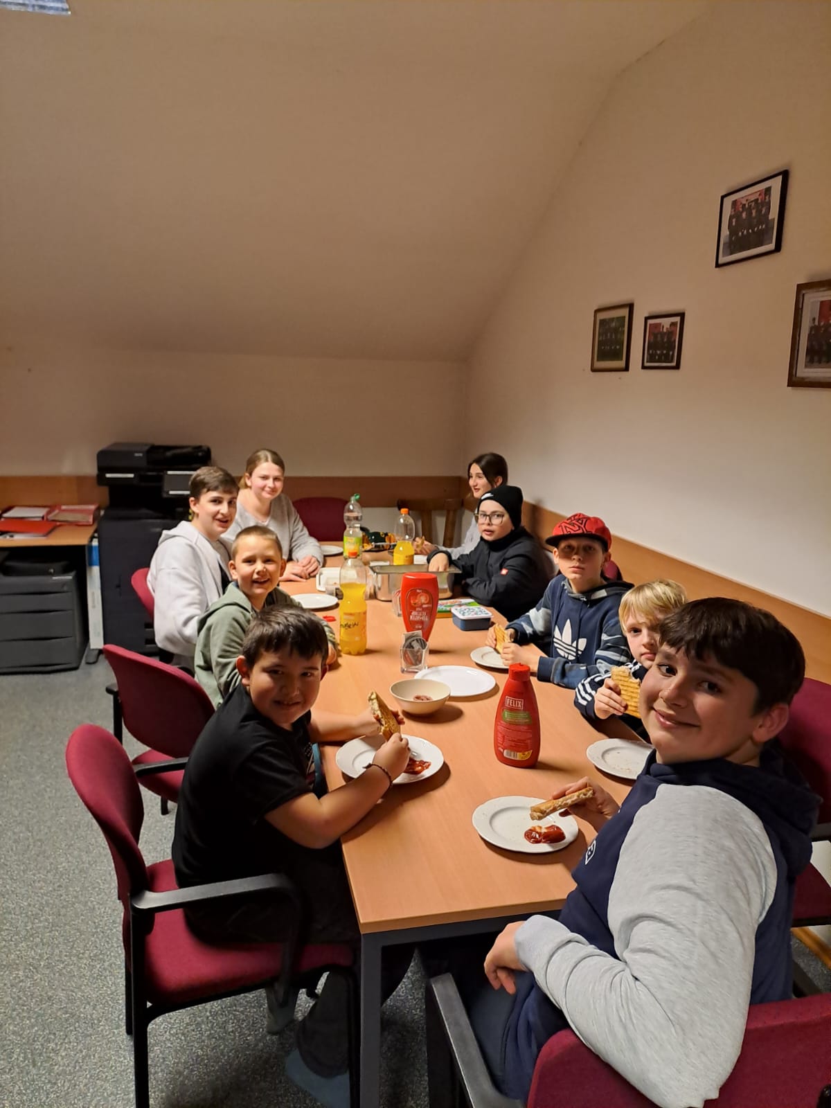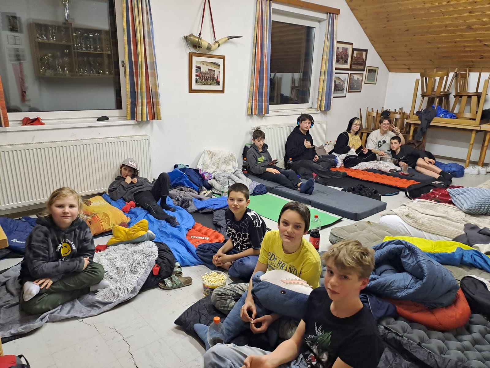 Nach dem Essen machte es sich die Jugendgruppe in unserem Mannschaftsraum gemütlich, um die Nacht zu verbringen. Mit Unterhaltungen, spaßigen Filmen sowie spannenden Geschichten ging die Nacht mit 3 Stunden Schlaf vorüber.